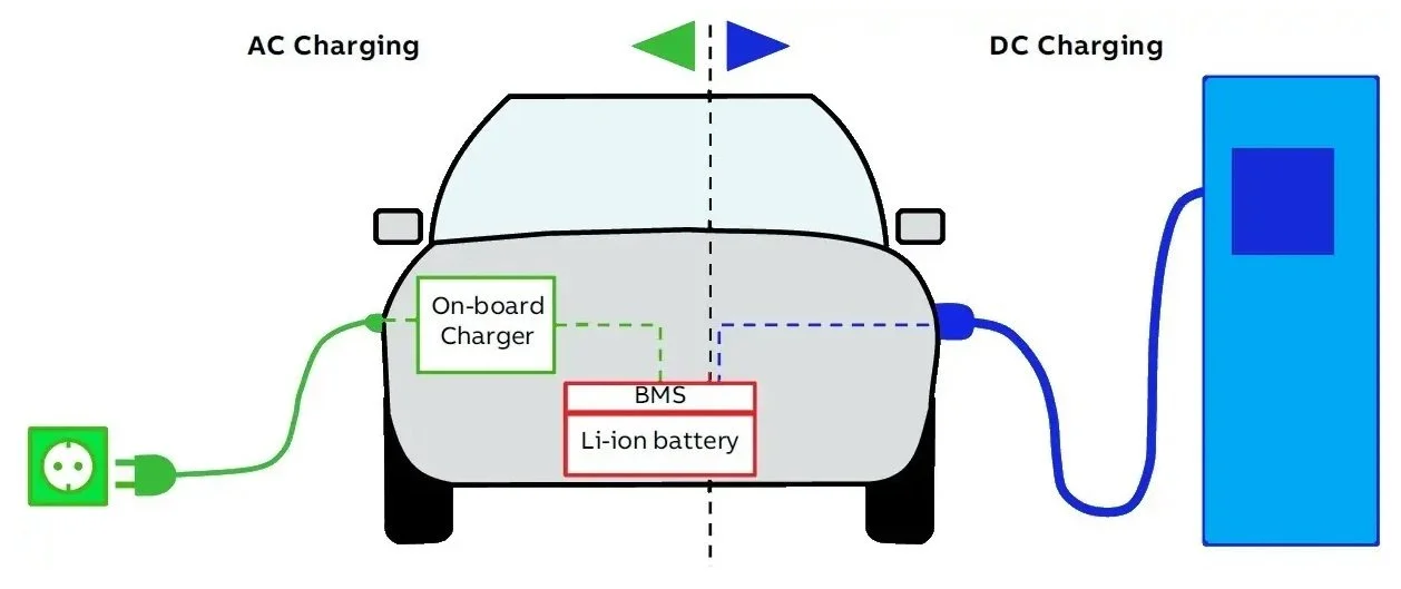 AC charging is achieved via a portable or hardwired EV charger that delivers an alternating current of between 2.4 – 22kW to the vehicle onboard battery management system. This slows the rate of charge as it needs to convert the AC power to DC power. Battery electrical energy is stored in a DC state.